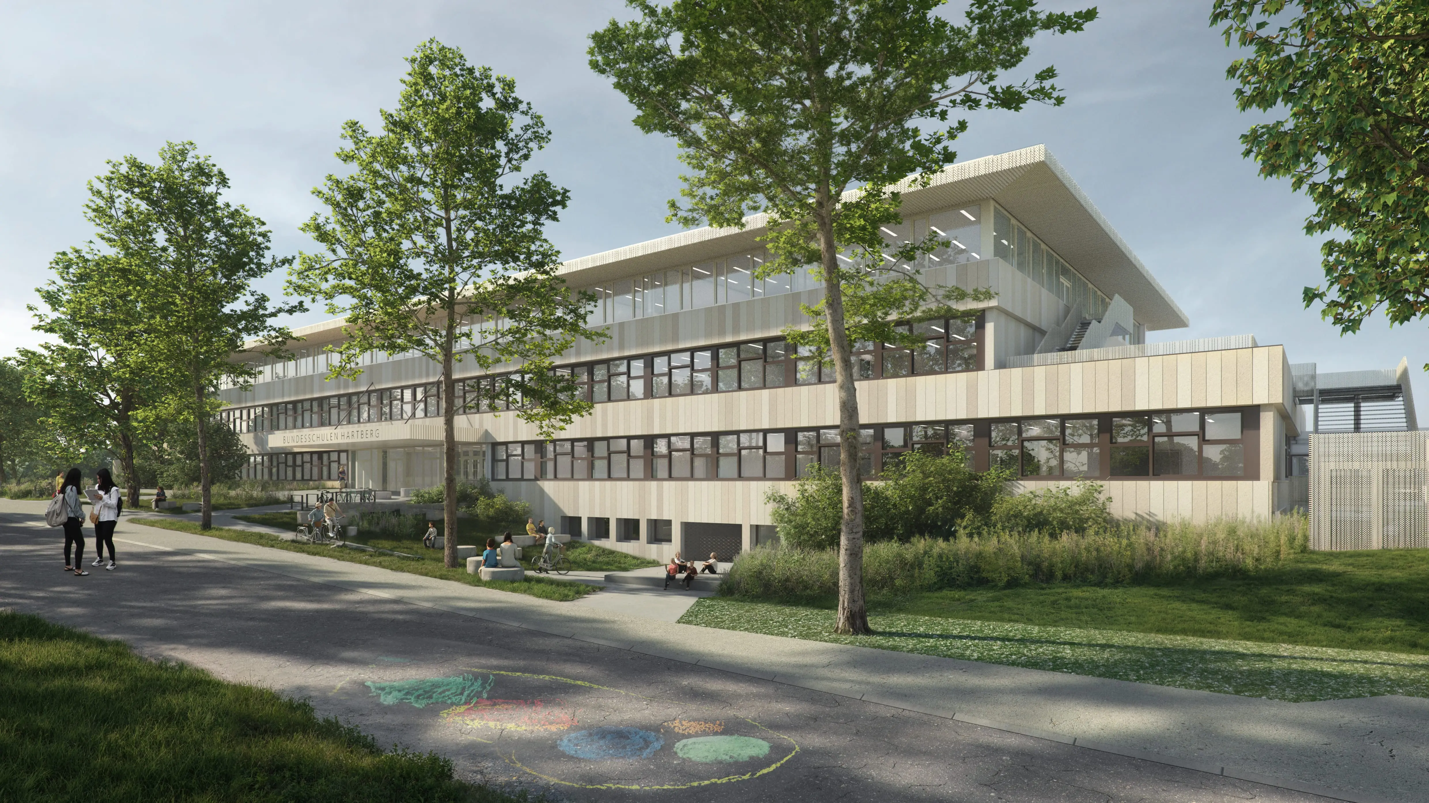 Das Projekt schafft zusätzliche Begegnungsräume und Aufenthaltszonen für die Schüler/innen in den bestehenden Innenhöfen. Diese werden durch die Neugestaltung der Mittelbereiche und die Öffnung der Klassenzimmer gestärkt und deutlich in den Mittelpunkt gerückt.