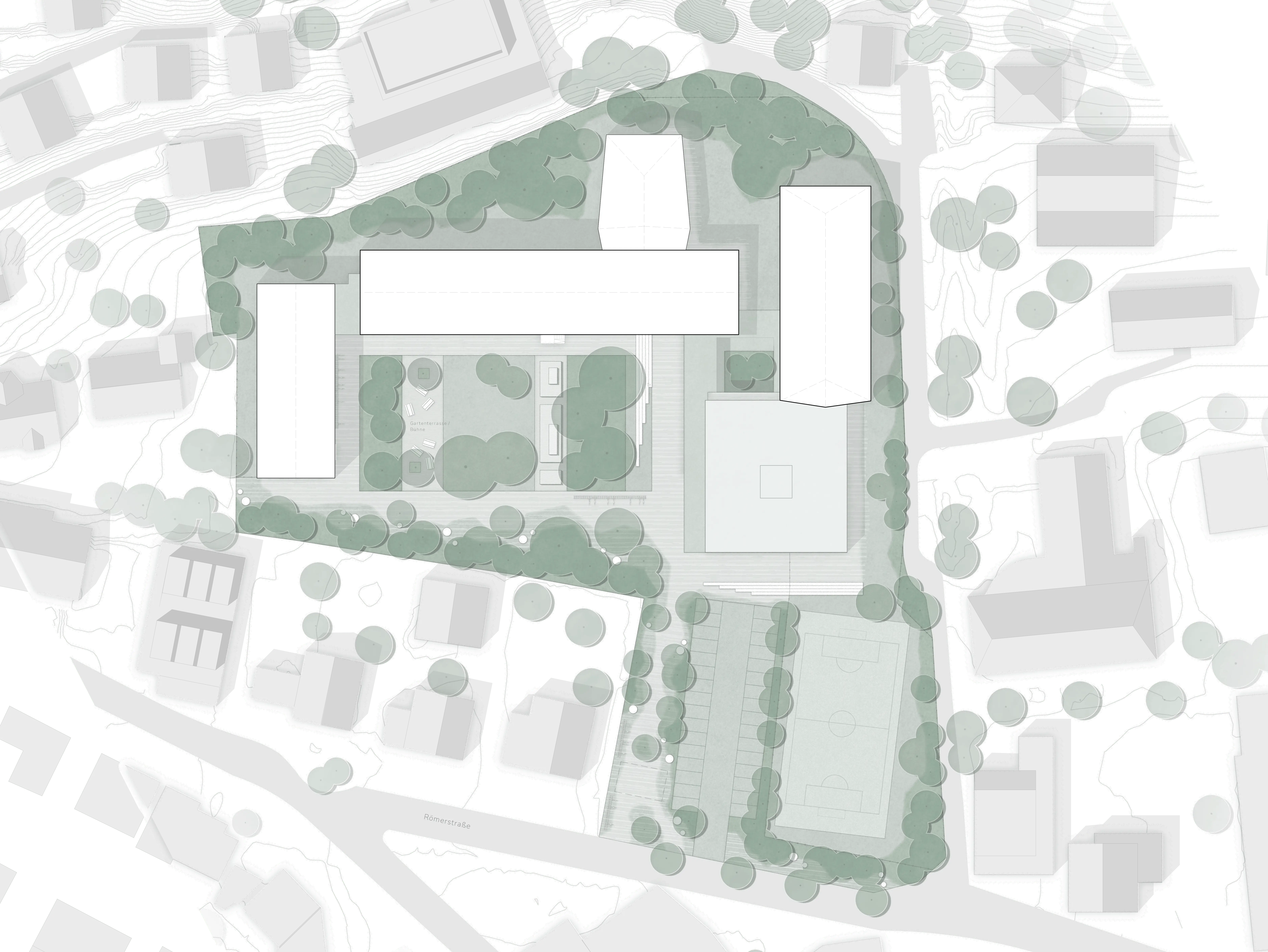 Das Freiraumkonzept begeistert durch seine spielerische Leichtigkeit und seine klare Struktur. Weiche Übergänge zwischen Grünflächen, Pflasterzonen und offenen Höfen schaffen Orte der Begegnung, der Erholung und der Inspiration. Eine großzügige Liegewiese lädt zum Durchatmen ein, während multifunktionale Flächen Platz für Sport, Spiel und Veranstaltungen bieten. Grünoasen, Sitzstufen, Terrassen – jede Ecke erzählt von einem Schulalltag, der sich nicht nur in Klassenzimmern, sondern im ganzen Areal entfalten darf.