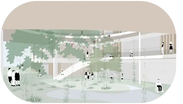 Vom südlichen Vorplatz aus führt der Weg durch vielfältige Bereiche, in denen Spiel, Bewegung, Lernen und Ruhe ineinandergreifen. In der Mitte dieses Stroms sammelt sich der Freiraum in einer ruhigen "Oase" mit Sitzinseln und Schatten, die eine hohe Aufenthaltsqualität bietet. Entlang des Weges reihen sich Spielbereiche, Bewegungszonen, ein Naschgarten und vielfältige Lernorte aneinander. Die Gestaltung ist bewusst ökologisch und strukturreich. Sie erinnert an die ruhige, naturnahe Stimmung der Alten Donau und fördert die Insektenvielfalt und Biodiversität. So wird der Außenraum selbst zu einem lebendigen Lern- und Lebensraum für die Schüler:innen.