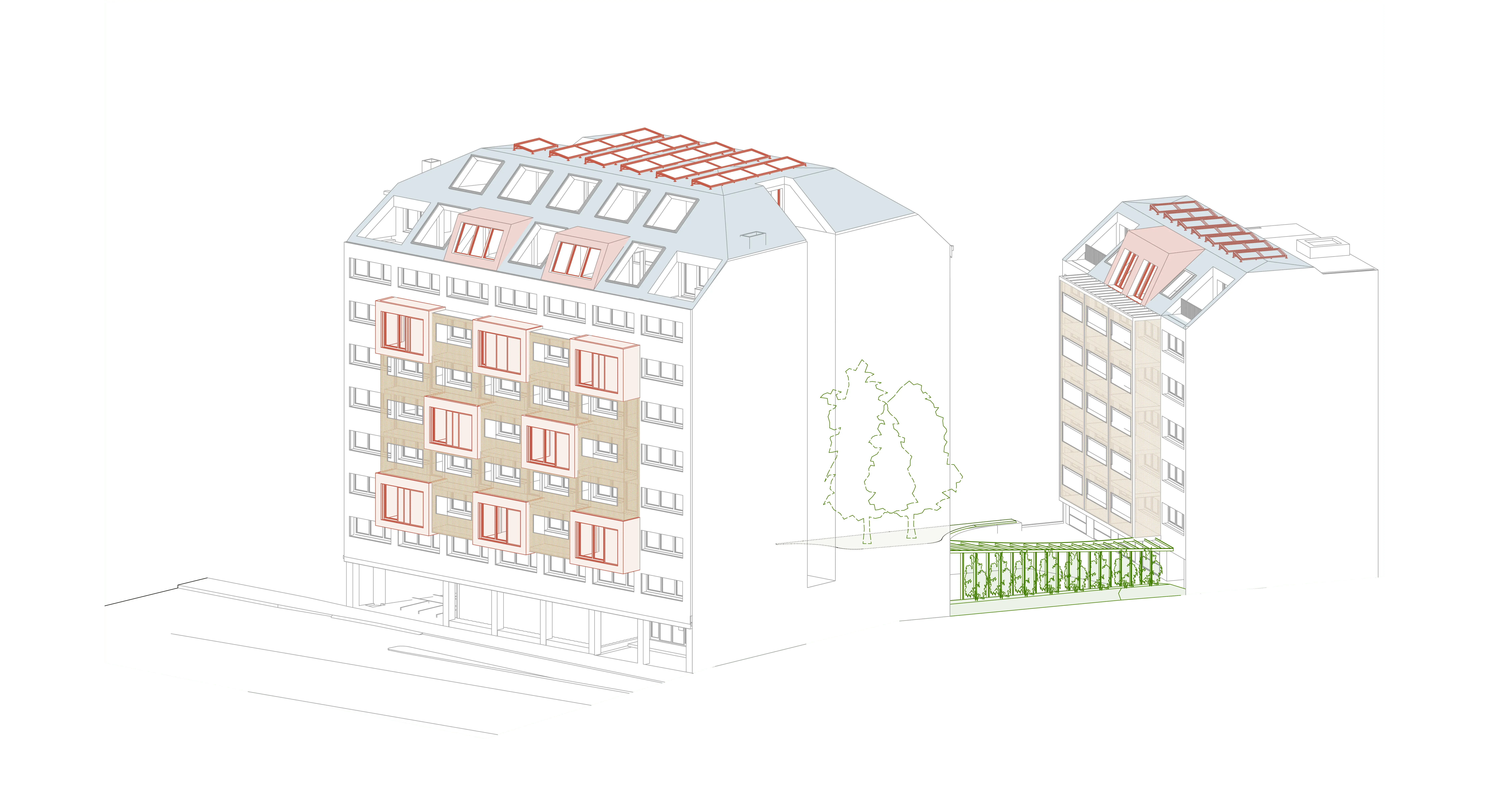 Architektonisch prägnant ist die Aufstockung des Dachgeschosses, die dem Ensemble eine neue Dimension verleiht. Die Tiefgarage mit integriertem Autolift wird als funktionales Element neu gedacht, um den Anforderungen urbaner Mobilität gerecht zu werden. Parallel dazu sorgt die Erneuerung der Gebäudetechnik für Effizienz und Nachhaltigkeit. Die großzügigen Grünflächen verbessern das Mikroklima und schaffen Rückzugsorte, die der städtischen Umgebung eine grüne, kühle Lunge verleihen.