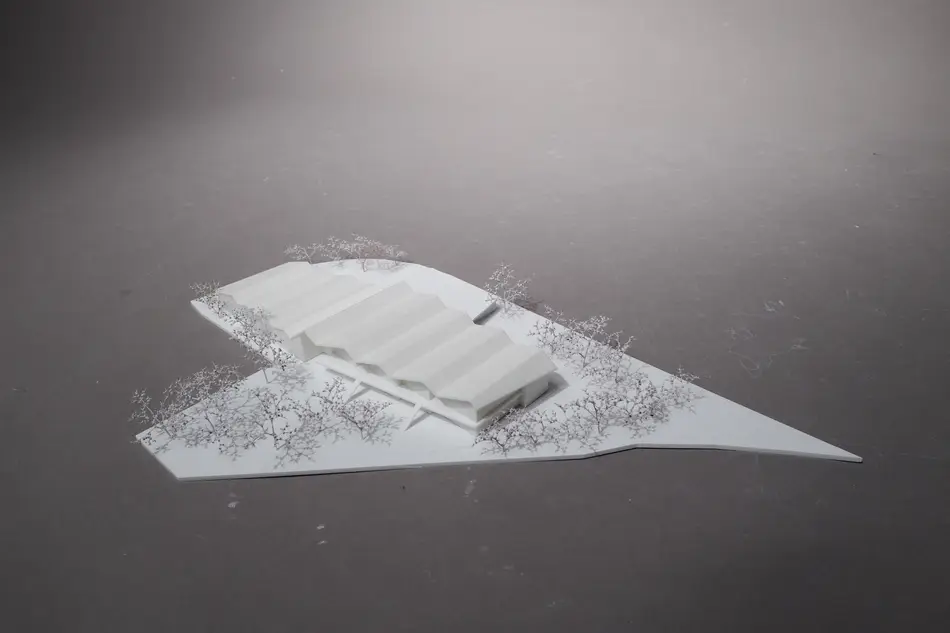 Ein kompaktes, zentrales Volumen unter einem gemeinsamen Dach definiert den Neubau – aus Holz konstruiert, modular geplant, ökologisch gedacht. Klare Formen fügen sich selbstverständlich in die Landschaft, während Photovoltaikmodule still Energie erzeugen.