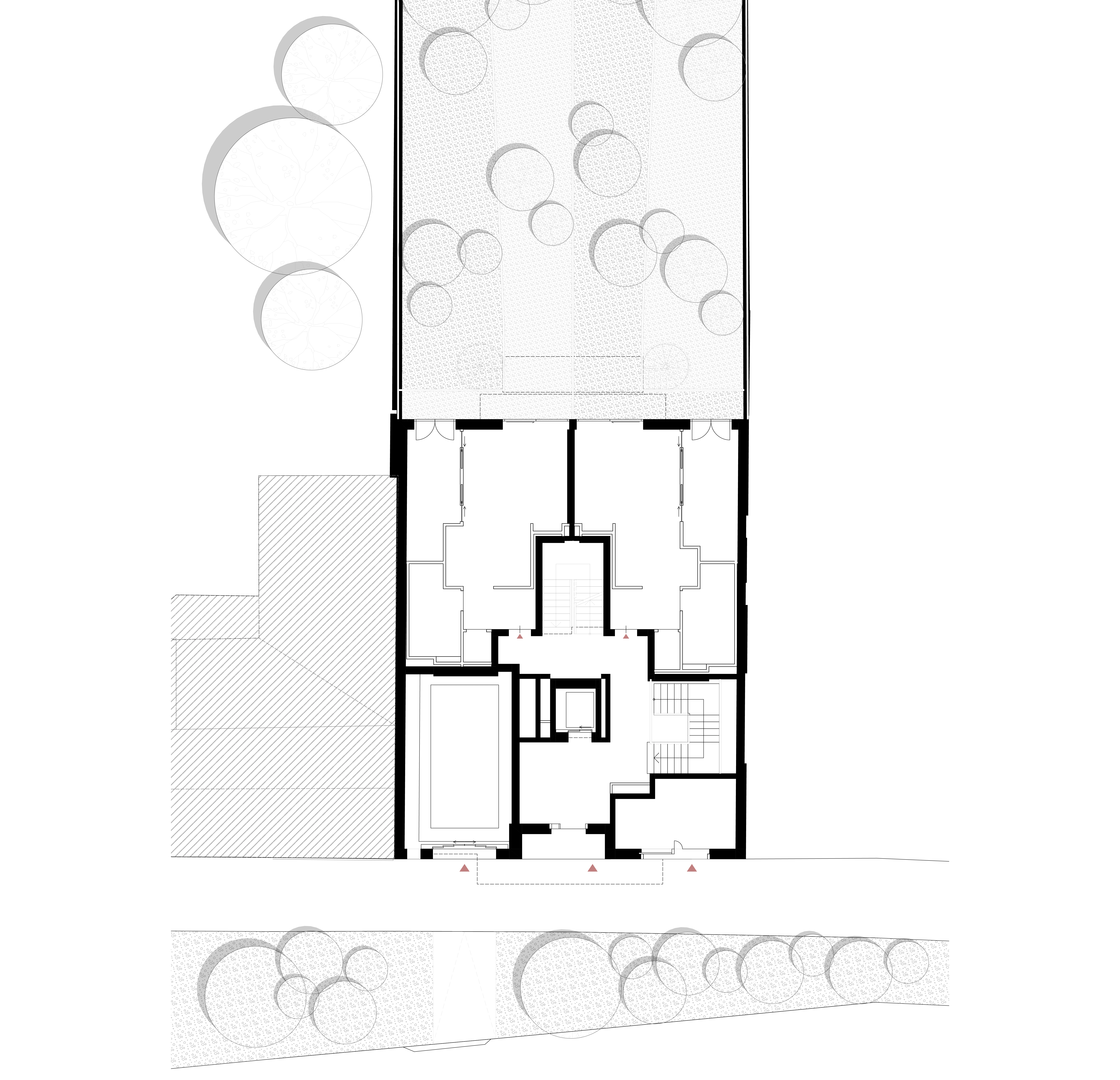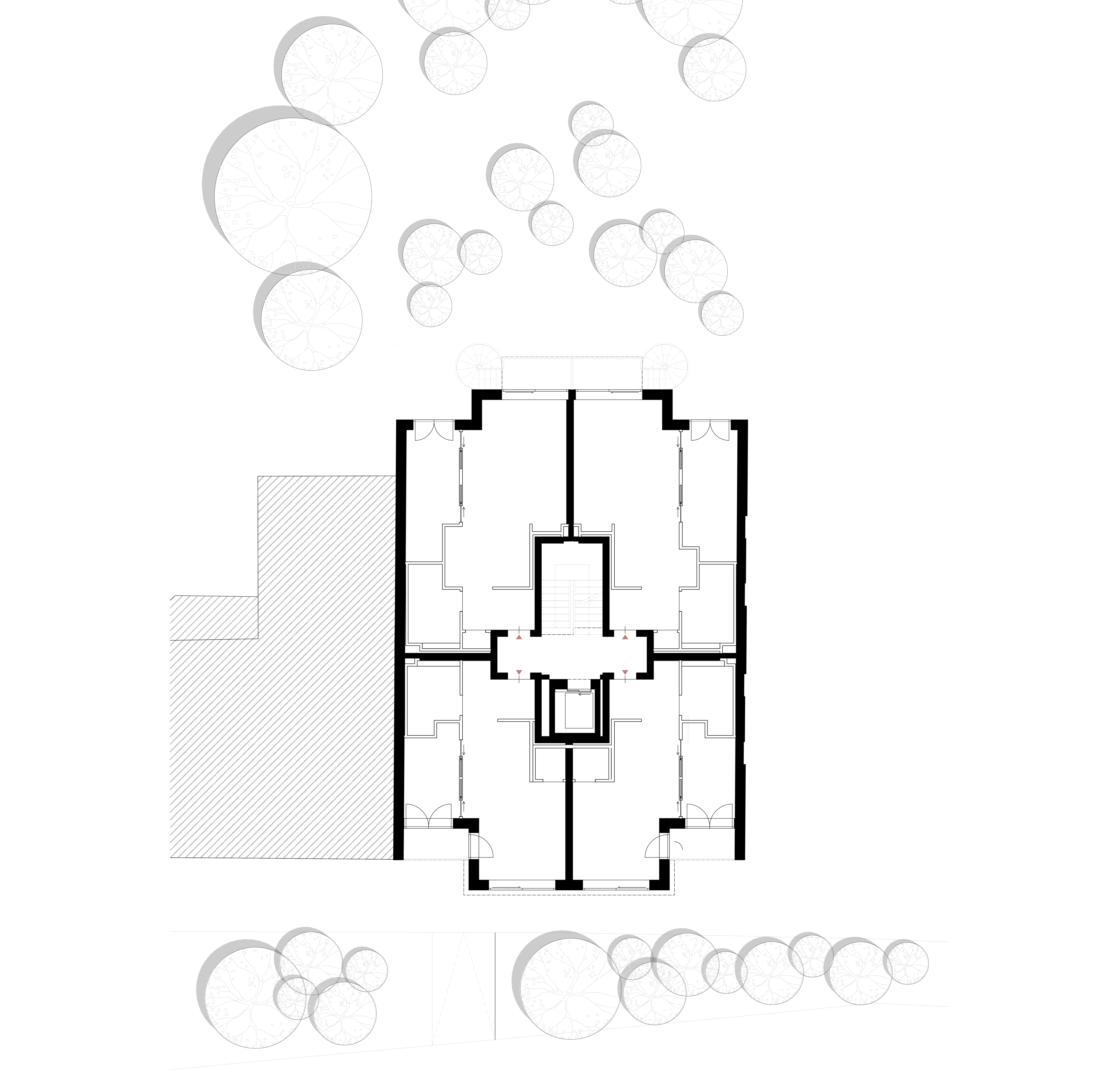 Jede der zwölf Wohnungen bietet direkten Zugang zu einem privaten Außenbereich: Gärten für das Erdgeschoss, über Wendeltreppen erschlossene Gartenflächen für das erste Obergeschoss, großzügige Balkone und exklusive Dachterrassen in den oberen Etagen. Diese klare Durchgängigkeit im Freiraumkonzept schafft nicht nur eine hohe Wohnqualität, sondern unterstreicht auch die Architektur: offen, verbindend und in Beziehung zur Umgebung gedacht. Die begrünte Fassadengestaltung – insbesondere die bepflanzten Erker – erweitern diese Idee bis in die Vertikale und machen das Haus zu einem lebendigen Teil seiner Nachbarschaft.