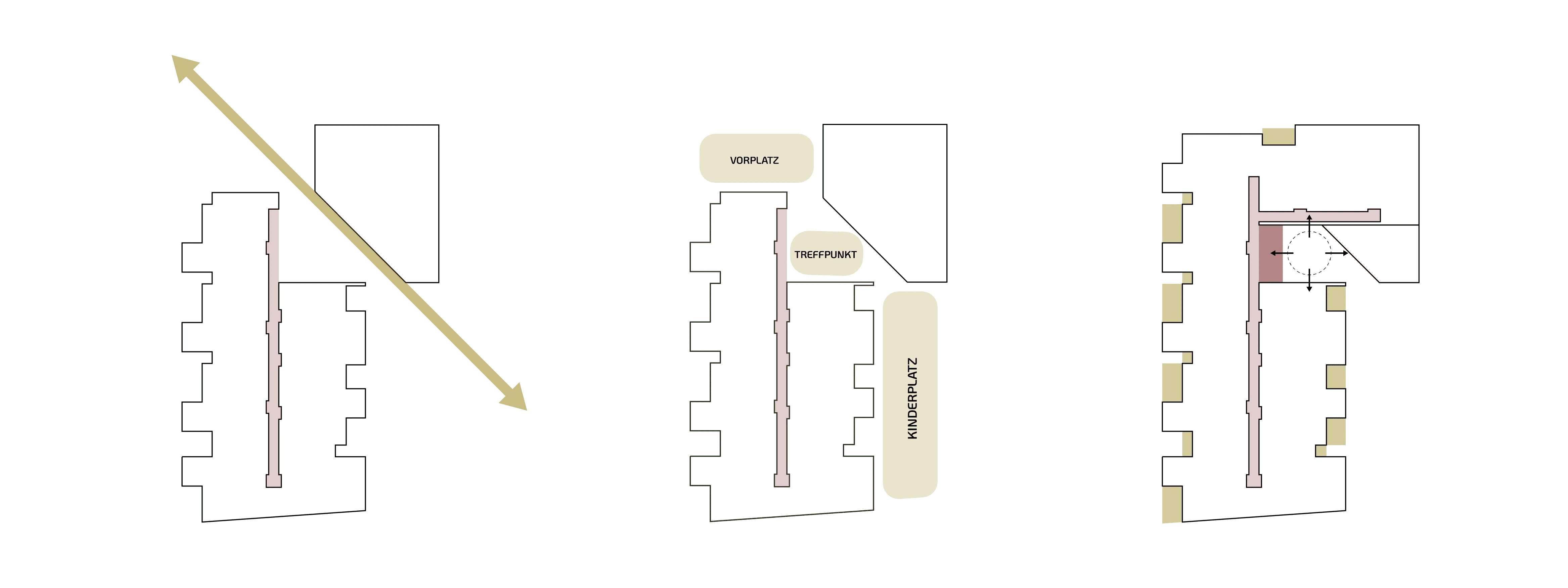 Das zentrale gestalterische Element des Gebäudes ist eine markante diagonale Achse, die nicht nur die Außenhülle prägt, sondern auch die inneren Raumfolgen vernetzt. Diese diagonale Struktur bildet das verbindende Herzstück des Wohnkomplexes und schafft eine offene, fließende Achse, die den Vorplatz mit dem angrenzenden Kinderspielplatz harmonisch verknüpft. Sie fungiert als sozialer Raum, der zur Begegnung und Interaktion einlädt und das Gemeinschaftsgefühl unter den Bewohnern maßgeblich stärkt.