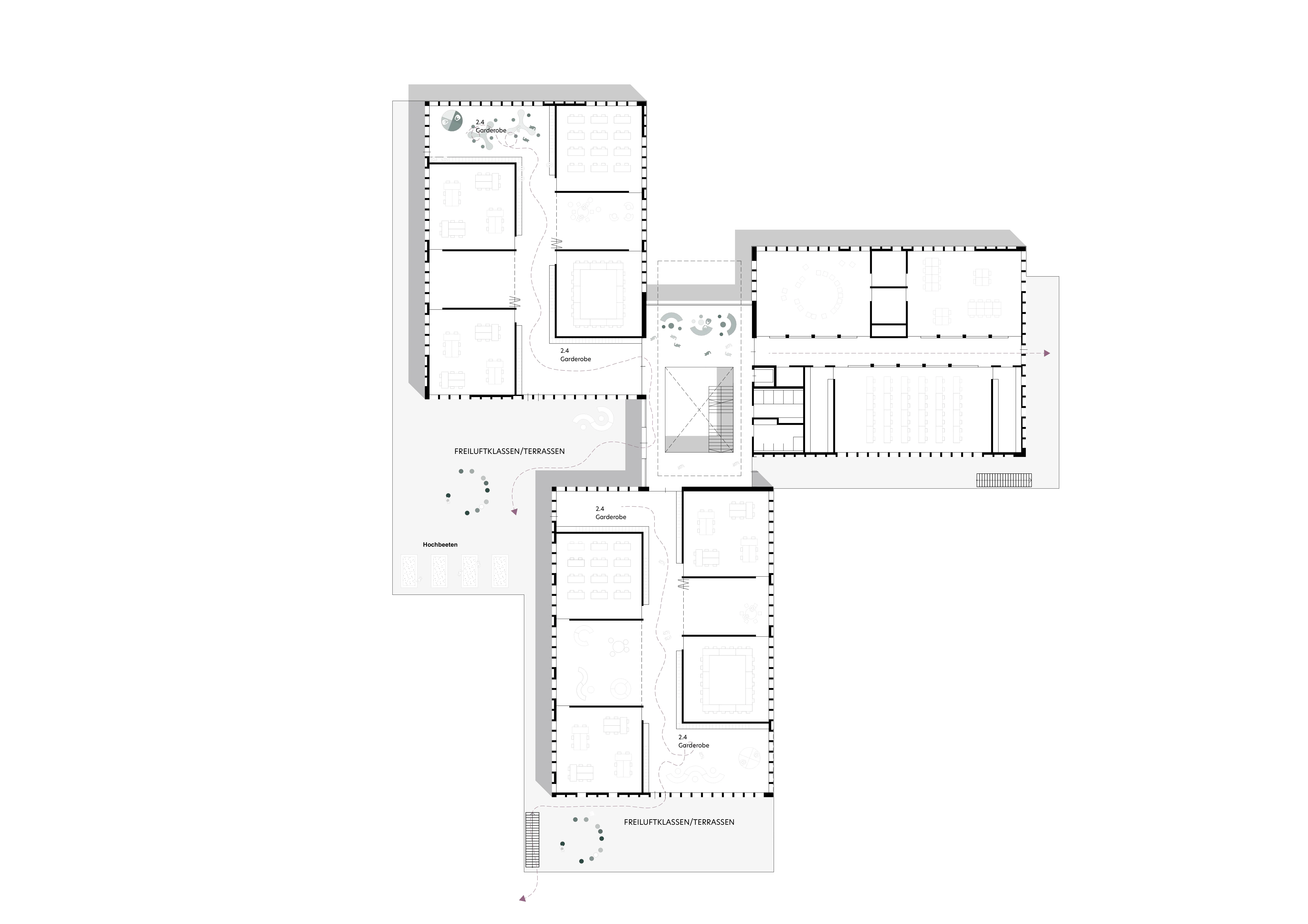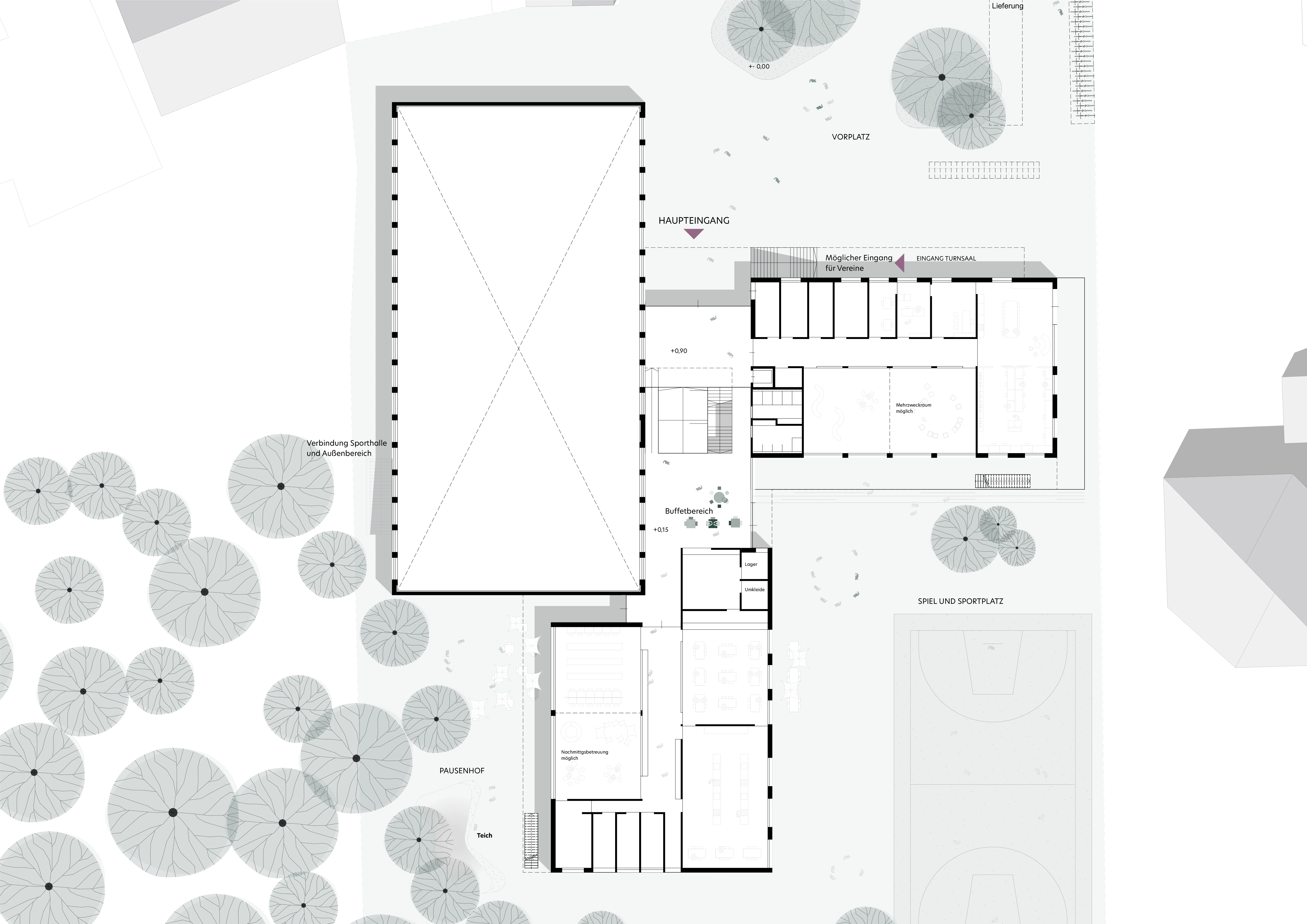Der städtebauliche Ansatz setzt auf ein Gebäude, das sowohl SchülerInnen anspricht als auch der Stadt einen attraktiven Raum bietet.Die Form des Gebäudes schafft vielfältige Außenräume:ein öffentlicher Vorplatz dient als Treffpunkt und Schuleingang, ausgestattet mit Grüninseln für Schatten und Sitzgelegenheiten. Ein dynamischer Rasenplatz bietet flexiblen Erholungsraum, während ein geschützter Bereich für ruhige Aktivitäten wie Lesen vorgesehen ist. Die Terrassen auf der Sporthalle ermöglichen Außenunterricht und Hochbeete. Die drei kompakten Baukörper fügen sich harmonisch in die Umgebung ein und bewahren die offenen Grünflächen des Gebiets.