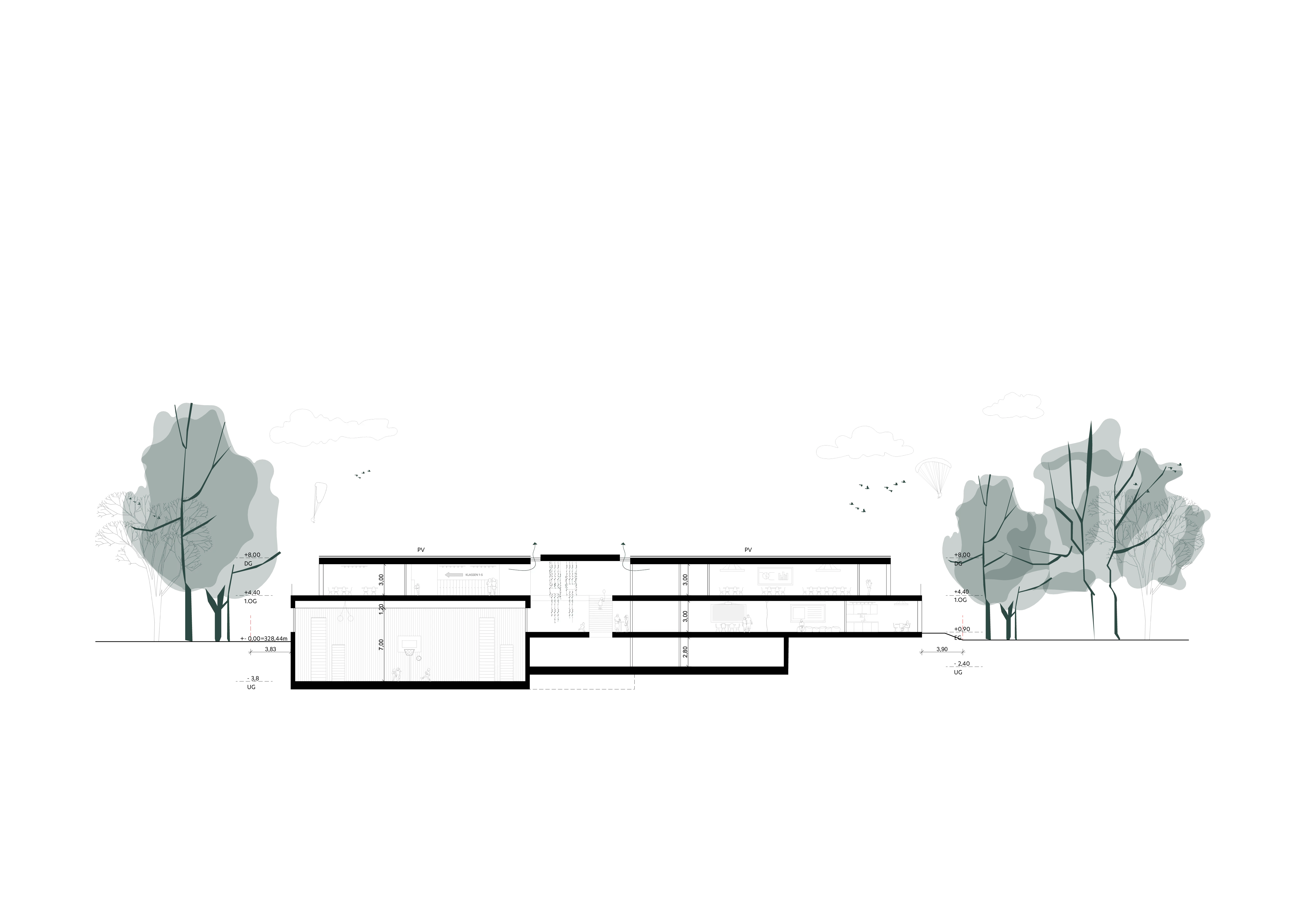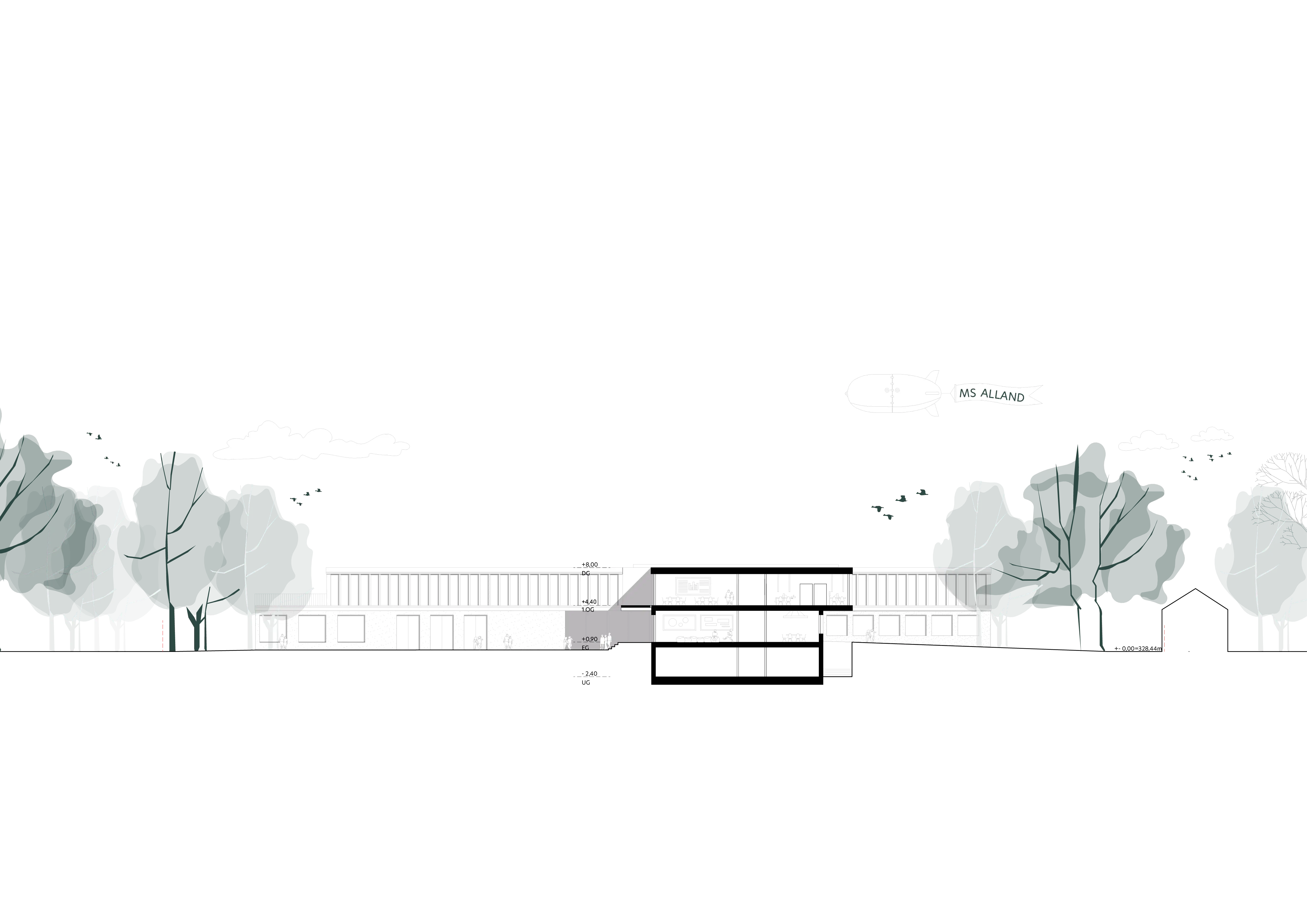 Der Wettbewerb für den Neubau der Mittelschule Alland setzt auf eine Vision, die Bildung und Gemeinschaft vereint. Ziel ist es, ein modernes Schulgebäude zu errichten, das nicht nur als Lernort dient, sondern auch als sozialer Treffpunkt für die Gemeinde fungiert. Der Entwurf hebt sich durch einen großzügigen Vorplatz hervor, der als Zentrum für Interaktion und Freizeitgestaltung fungiert. Von diesem zentralen Platz aus führen Wege in den erweiterten Grünraum und verbinden nahtlos das Freizeitangebot für SchülerInnen mit den Bedürfnissen und Aktivitäten der Nachbarschaft.