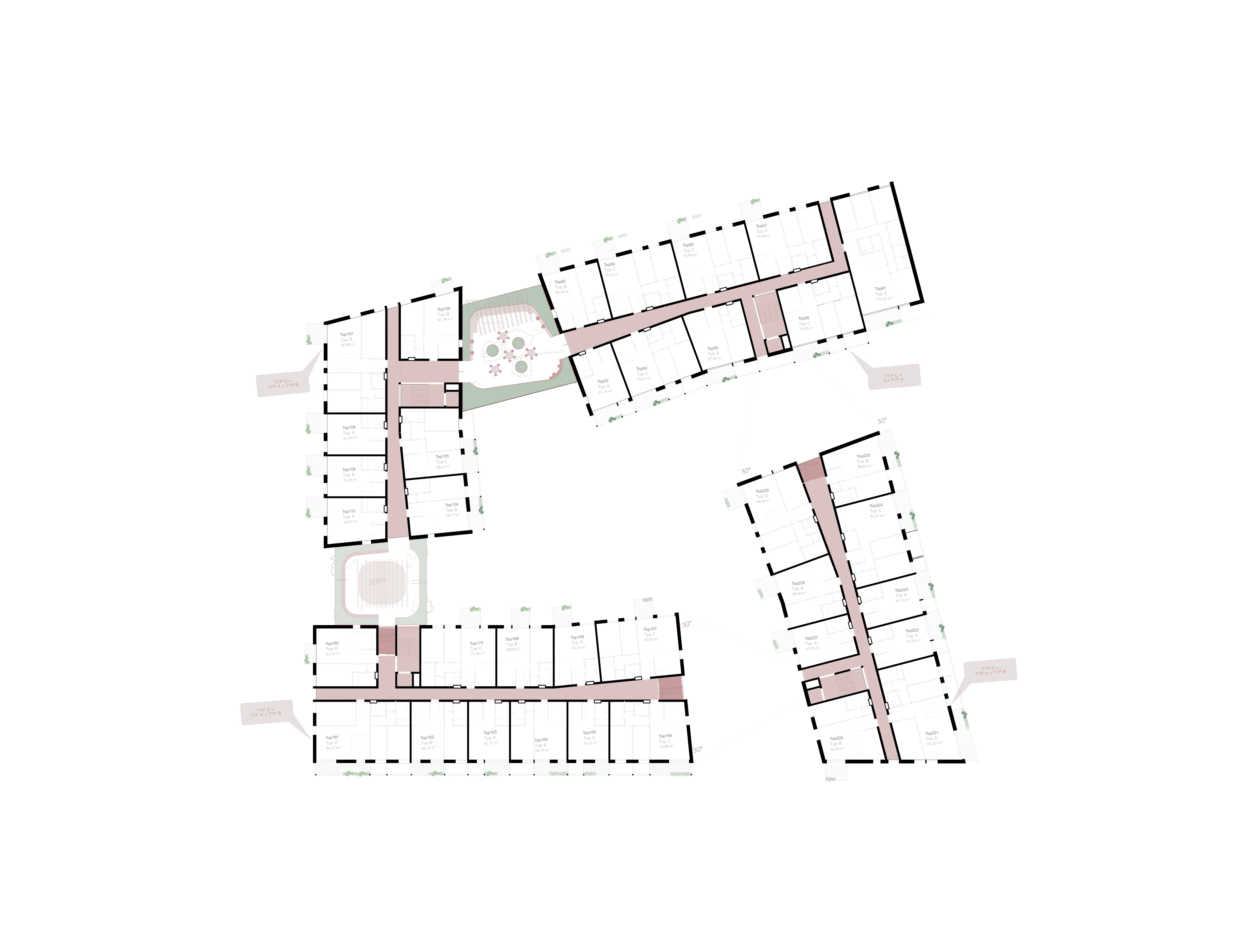 Der Grundriss der Wohnungen bietet Flexibilität und berücksichtigt alle geförderten Typologien. In der Aufteilung wurden klar definierte Bereiche für Nebenräume sowie Wohnbereiche geschaffen, die hohe Flexibilität und Anpassungsfähigkeit an zukünftige Veränderungen ermöglichen. Auf diese Weise kann auf einfache Weise von kleinen zu großen Wohnungen gewechselt werden und umgekehrt.