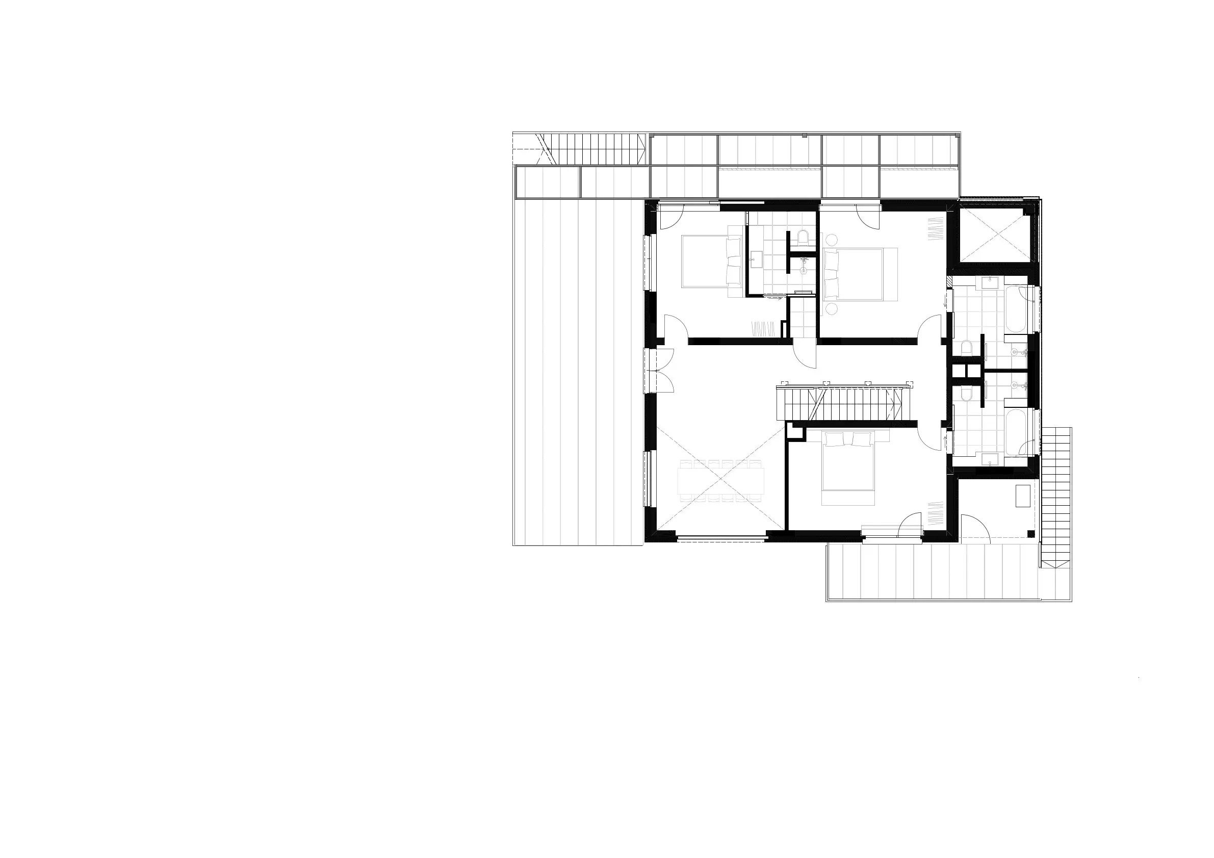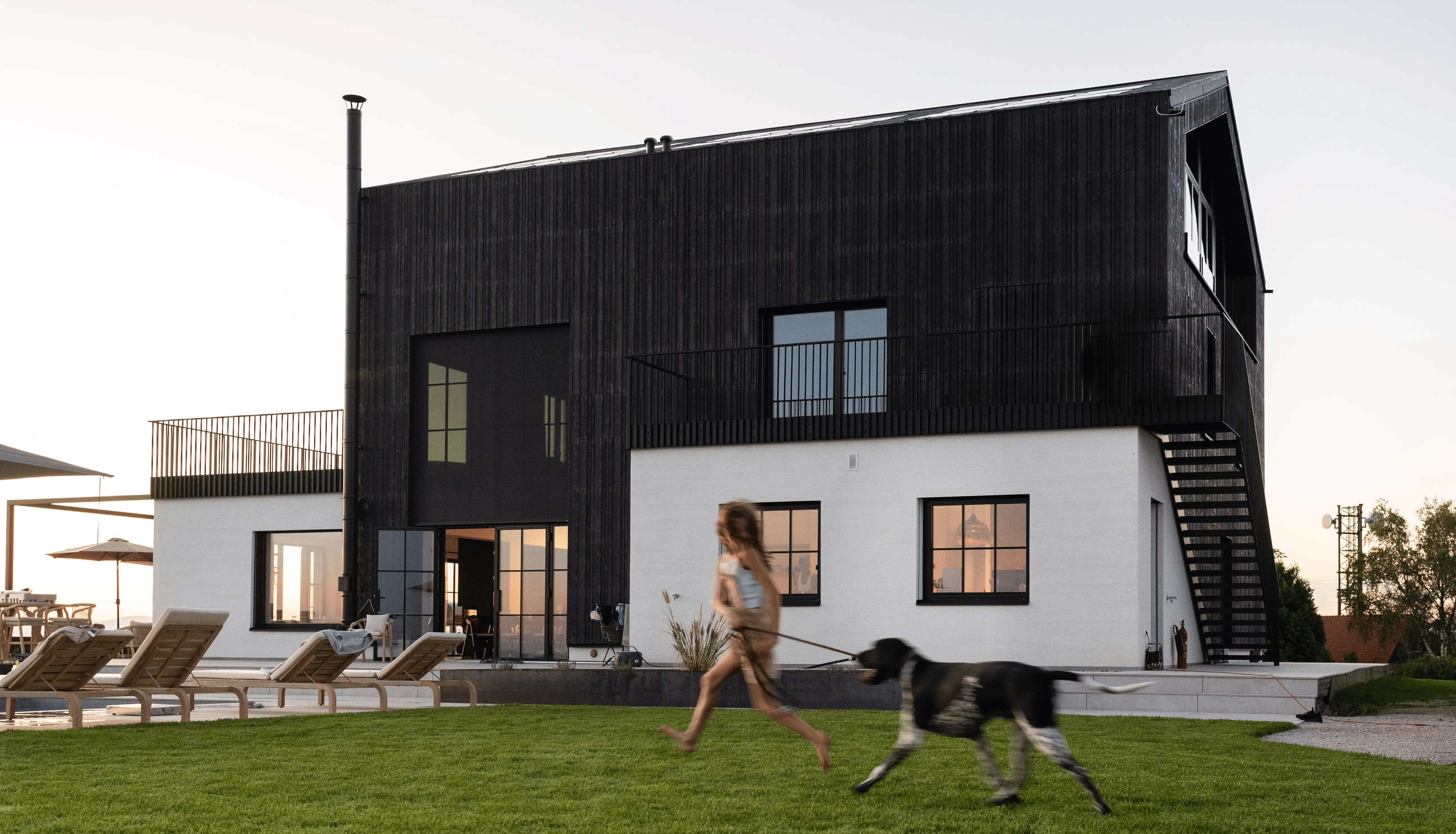 Mit großer Sorgfalt wurden Materialien ausgewählt, die in Farbe und Textur mit der umliegenden Natur verschmelzen. Der Kontrast zwischen dem massiven Erdgeschoss und dem leichten Holzbau in den oberen Geschossen verleiht der Villa eine dynamische Ästhetik, während das schwarze Dach die Krönung des Designs bildet und stolz über die Landschaft thront.