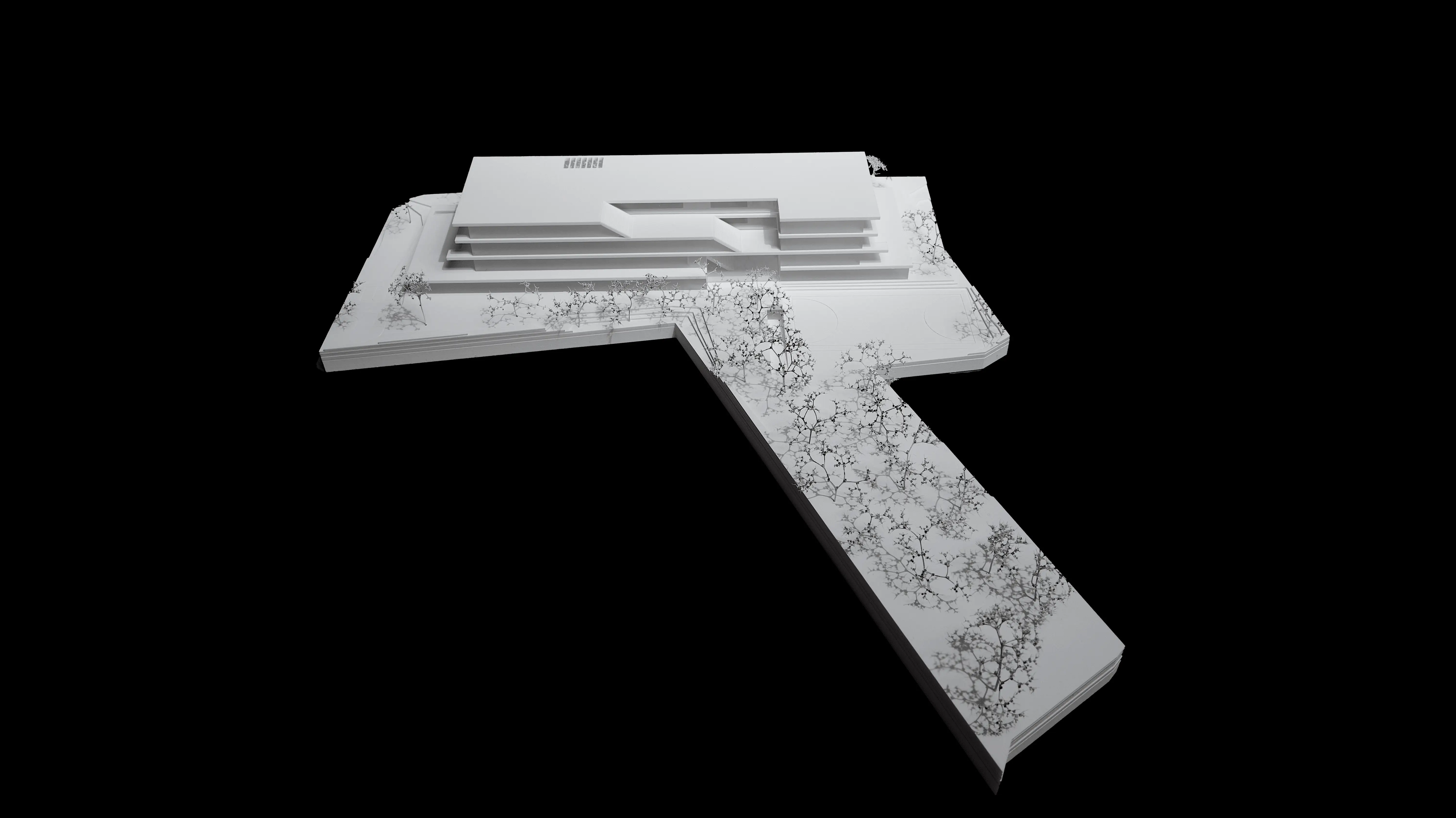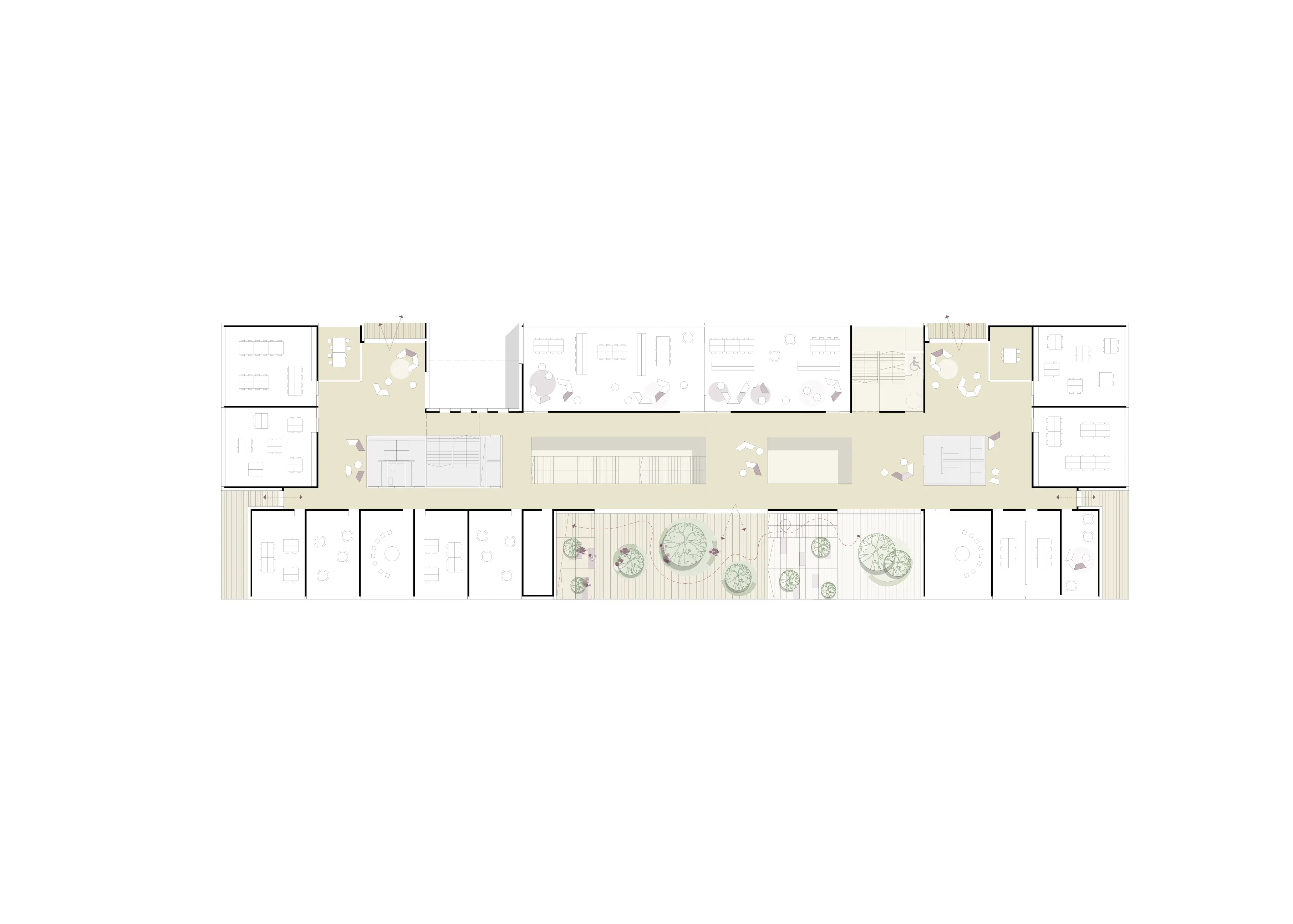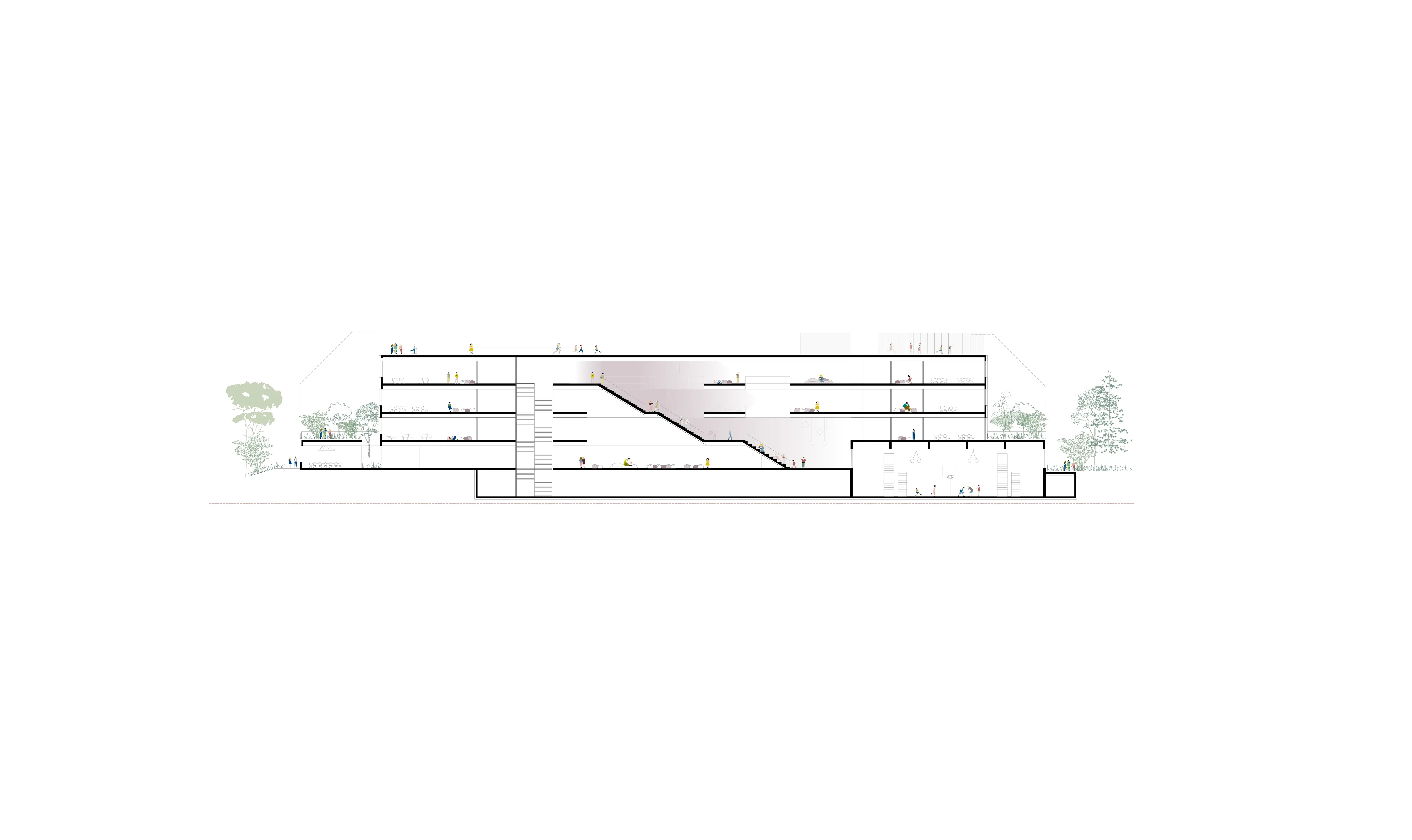 Die oberen Geschosse öffnen sich zu einer grünen Kaskade aus Treppen und Freiräumen. Diese vertikale Erschließung schafft eine dynamische Verbindung bis zum Dach, wo Sportflächen unter freiem Himmel angeordnet sind. Gleichzeitig sorgt die gezielte Subtraktion im Bauvolumen für natürliche Belichtung und eine offene, lichtdurchflutete Mitte.