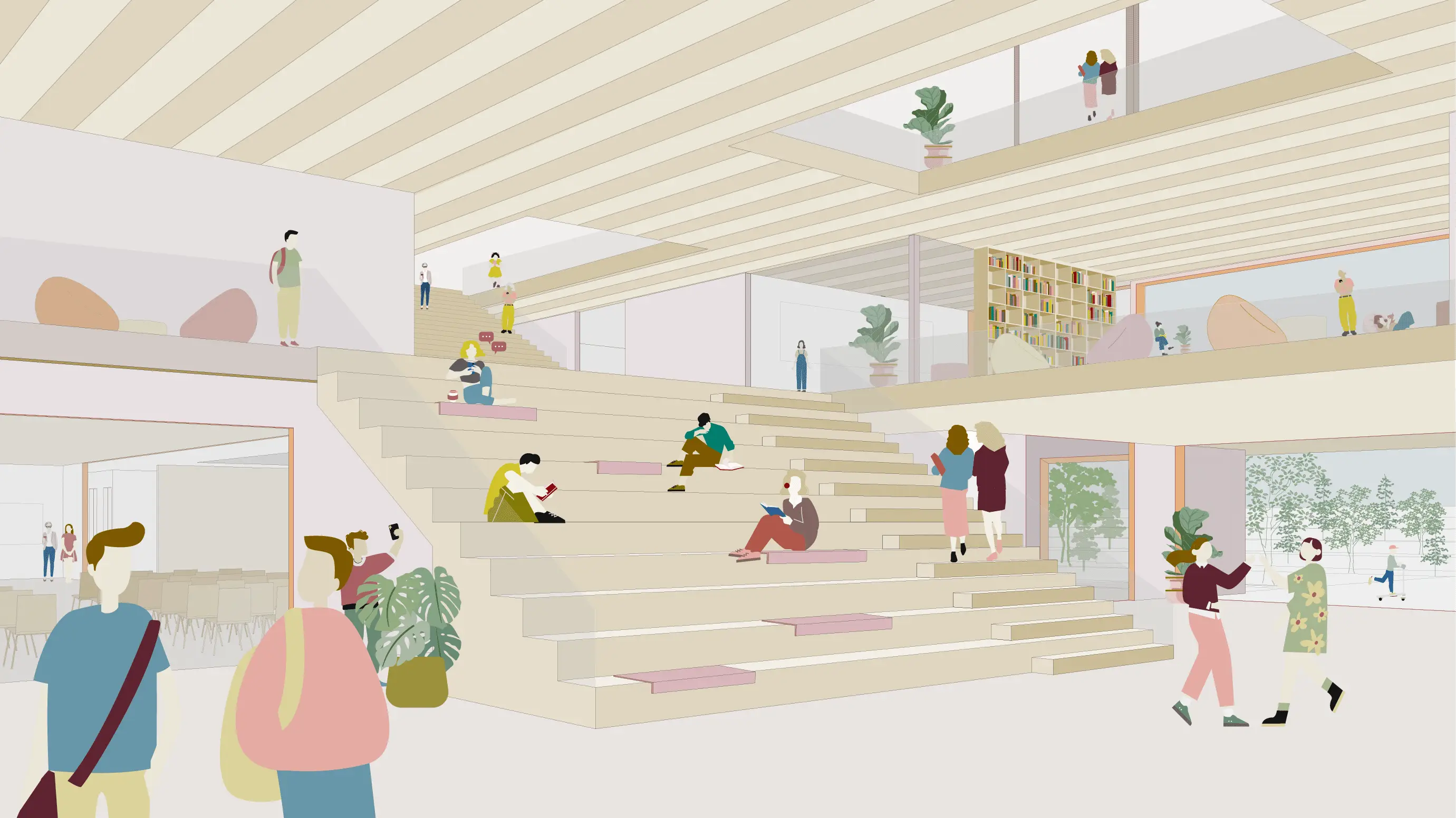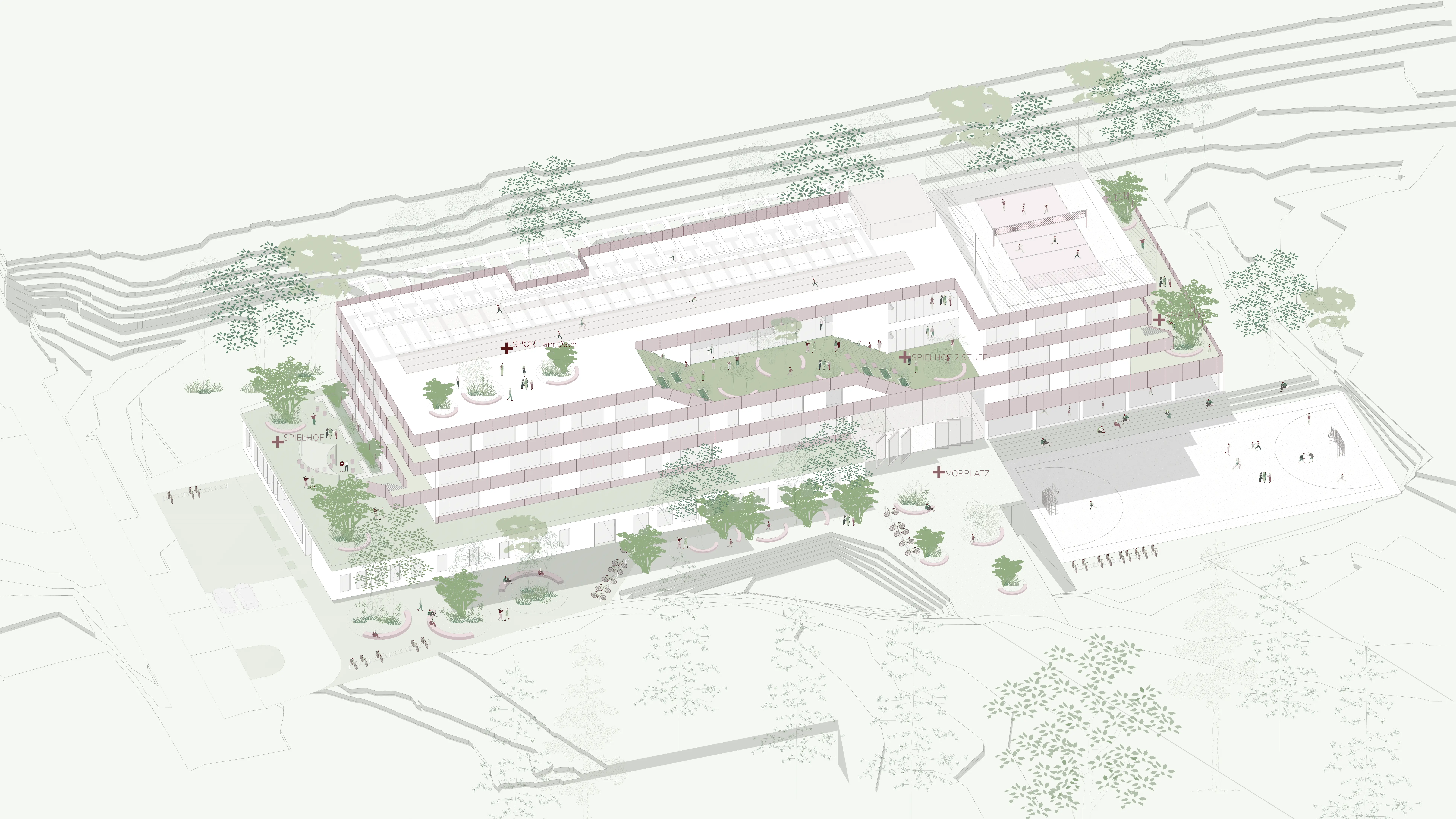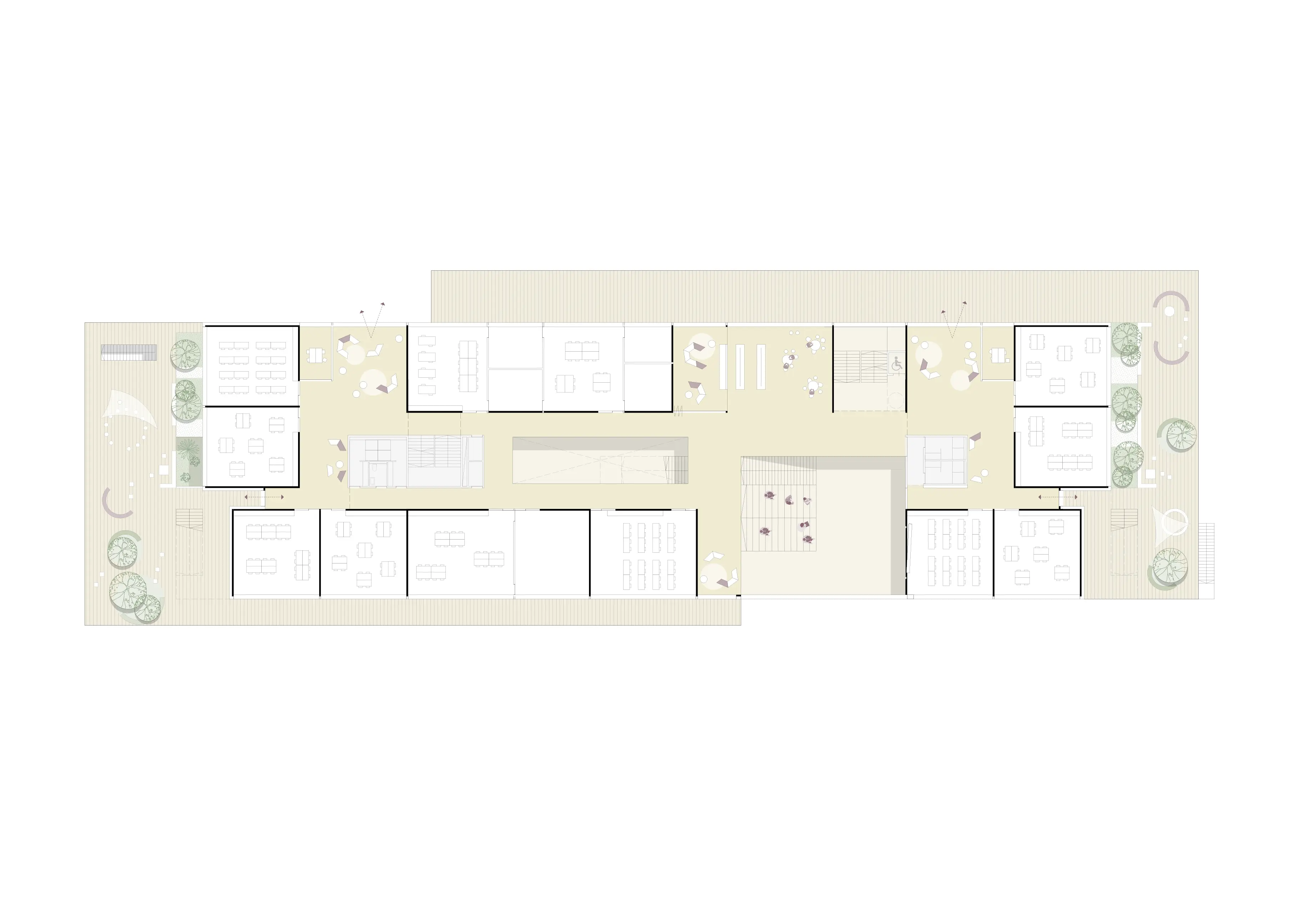 Treppen und offene Cluster steigen wie eine Kaskade nach oben und verbinden Innenräume mit grünen Außenbereichen. Der Dachbereich wird zum Sport- und Bewegungsraum, die vertikale Erschließung verwandelt das Gebäude selbst in einen lebendigen Schulhof.