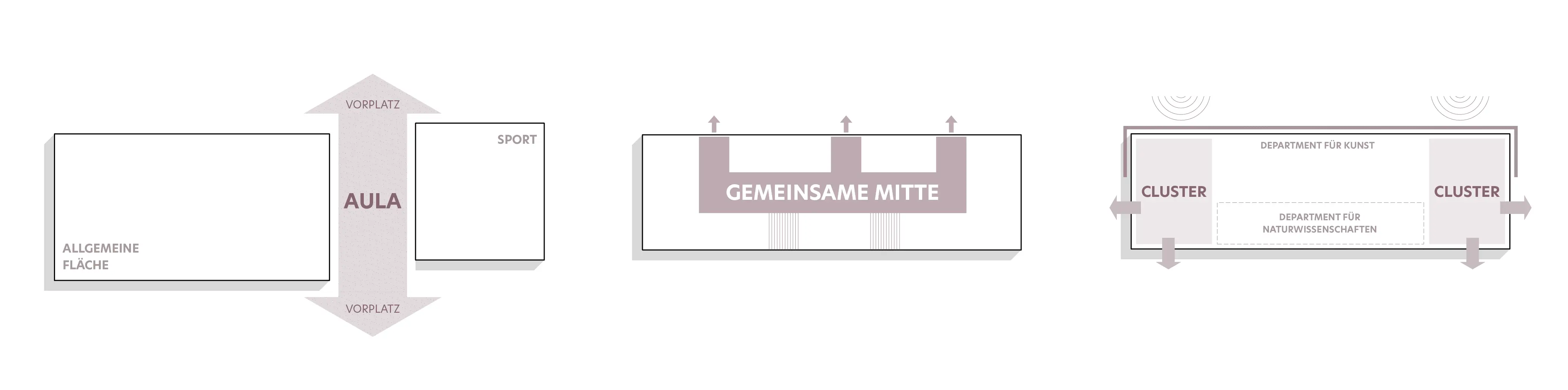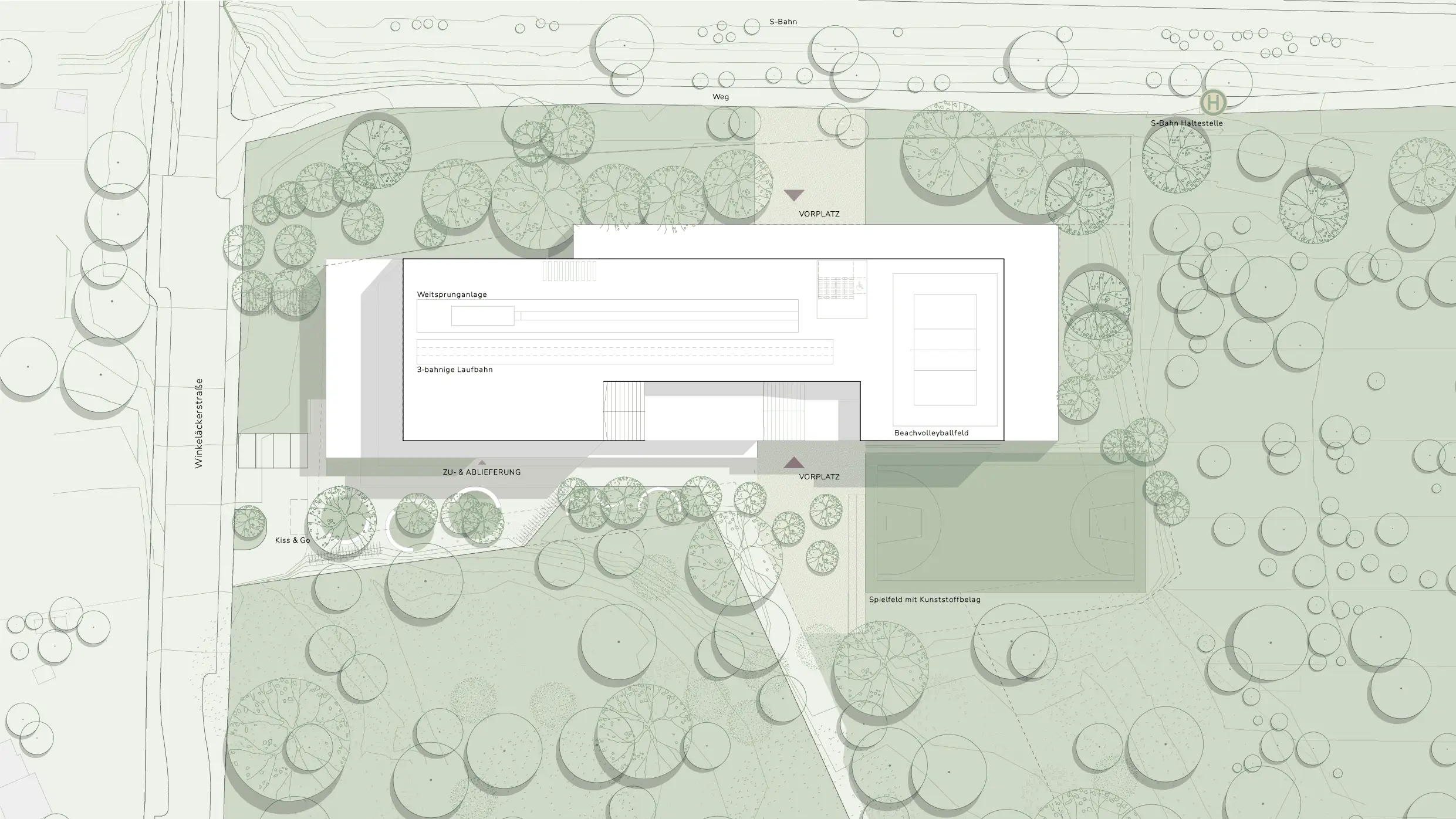 Das Projekt nutzt die besonderen Proportionen des Grundstücks, um ein kompaktes Bauvolumen zu schaffen. Dadurch entstehen großzügige Außenflächen, die für eine Schule von zentraler Bedeutung sind. Der langgestreckte Baukörper entlang der Bahngleise verbindet die unterschiedlichen Zugänge über eine zentrale Passage und schafft Klarheit im städtebaulichen Konzept.